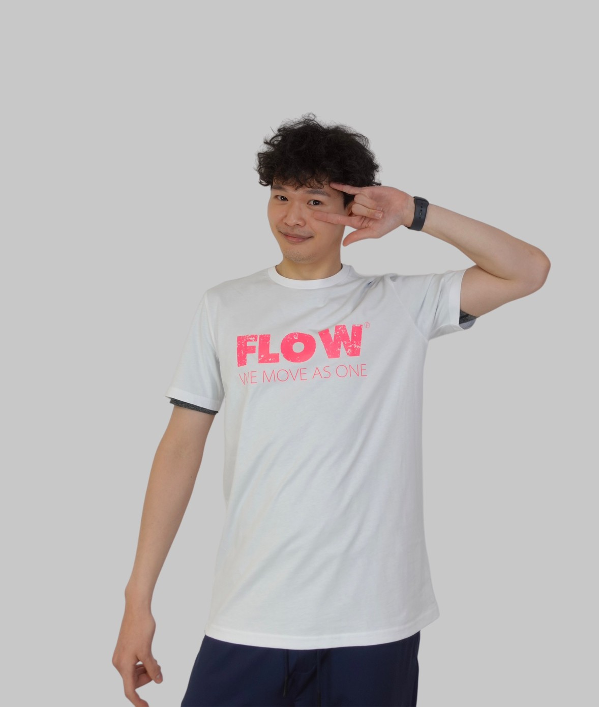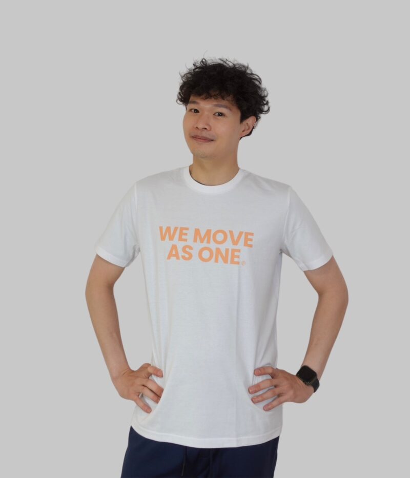 白底淡橘字 WE MOVE AS ONE (White with light orange text ‘WE MOVE AS ONE’) |